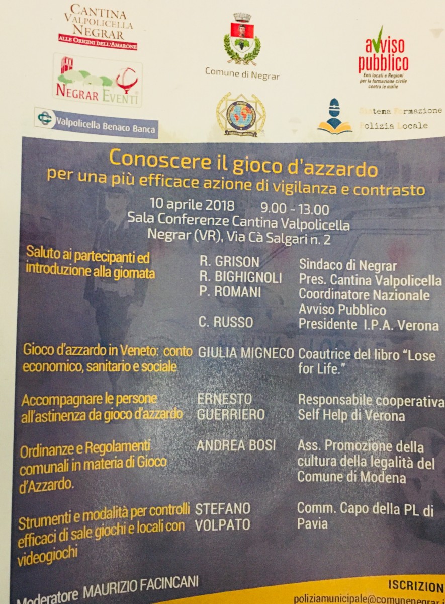 “Conoscere il gioco d’azzardo per una più efficace azione di vigilanza e contrasto”. Questo il titolo del convegno organizzato dal comando di polizia locale di Negrar in collaborazione anche con Avviso Pubblico che si è svolto lo scorso 10 aprile, nella splendida location della Cantina Valpolicella Negrar.