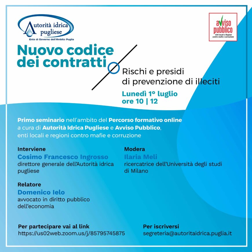 Saranno quattro i seminari formativi online attraverso i quali, l’Autorità idrica pugliese in collaborazione con Avviso Pubblico, mira ad approfondire le conoscenze dei partecipanti in materia di prevenzione del rischio di infiltrazioni mafiose, corruzione e riciclaggio, in particolare in relazione ai progetti finanziati con fondi del PNRR. Titolo del ciclo di incontri “La gestione dei contratti pubblici e il monitoraggio dei progetti PNRR”.