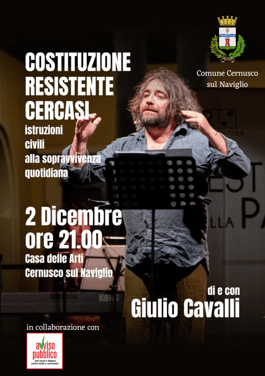 Il prossimo 2 dicembre, alle ore 21, la Casa delle Arti ospiterà l’evento di Giulio Cavalli “Costituzione resistente cercasi: istruzioni civili alla sopravvivenza quotidiana”.