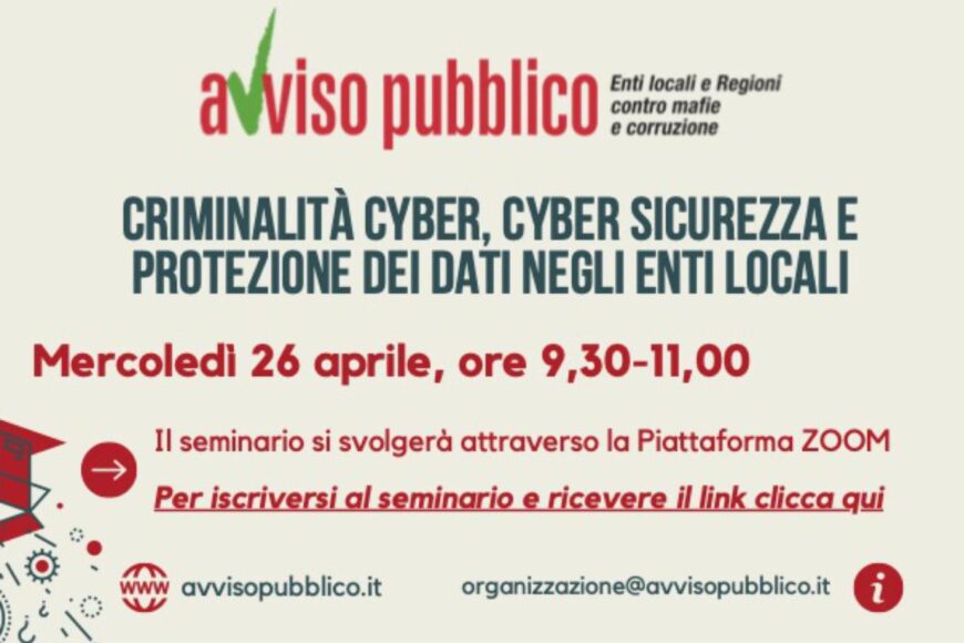 “CRIMINALITÀ CYBER, CYBER SICUREZZA E PROTEZIONE DEI DATI NEGLI ENTI LOCALI”: IL 26 APRILE IL WEBINAR DI AVVISO PUBLICO