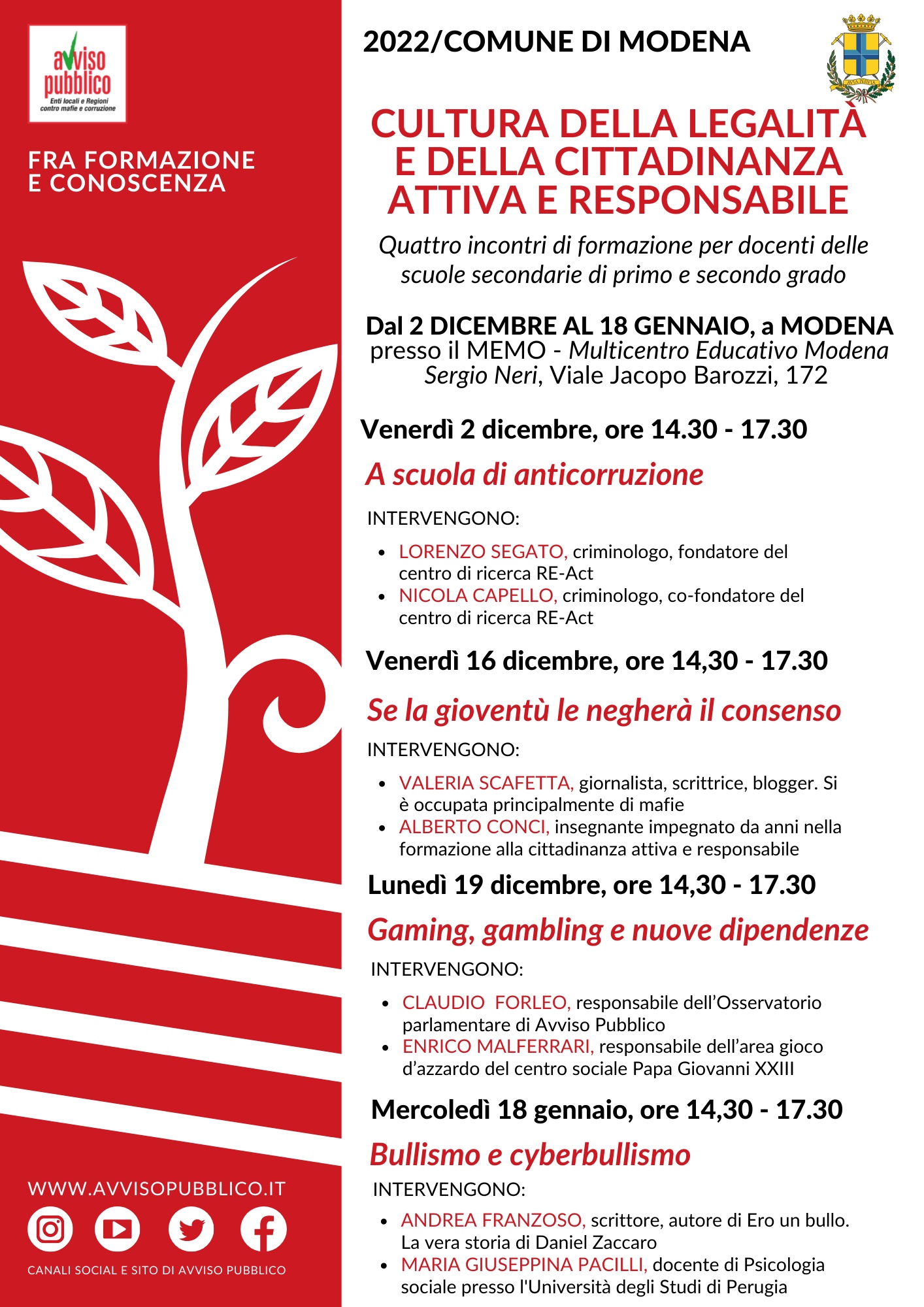 “Cultura della legalità e della cittadinanza attiva e responsabile” è il titolo del percorso formativo in quattro incontri per insegnanti delle scuole medie e superiori, promosso dal Comune di Modena e organizzato da Avviso Pubblico, che si svolgeranno dal 2 dicembre 2022 al 18 gennaio 2023, presso il MEMO – Multicentro educativo Modena Sergio Neri, in viale Jacopo Barozzi, 172.