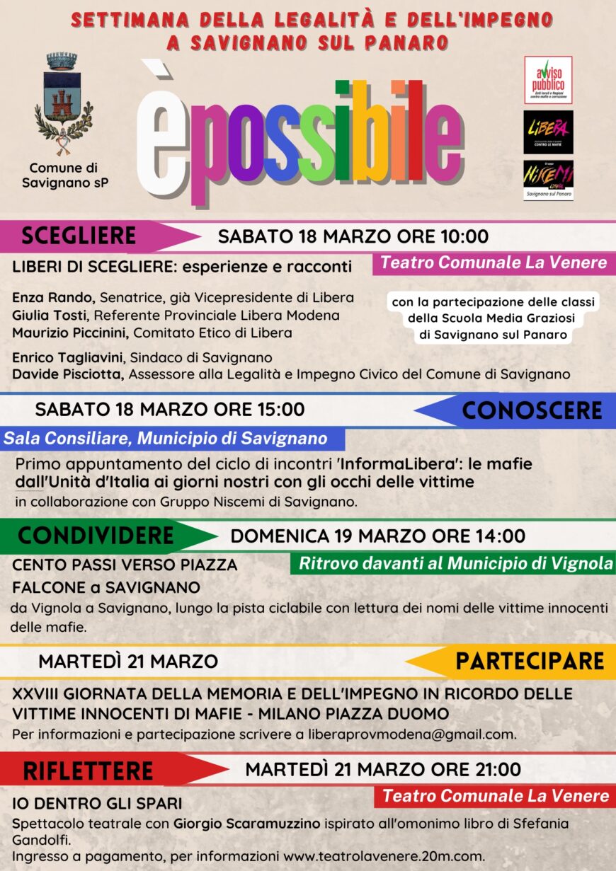 L’occasione è la Settimana della legalità e dell’impegno, promossa dall’amministrazione della città in vista della ventottesima Giornata Nazionale della Memoria e dell’Impegno in ricordo delle vittime innocenti delle mafie che si terrà a Milano il 21 marzo. Gli eventi sono organizzati in collaborazione con Libera nazionale, il Gruppo Niscemi di Libera di Savignano sul Panaro e Avviso Pubblico.
