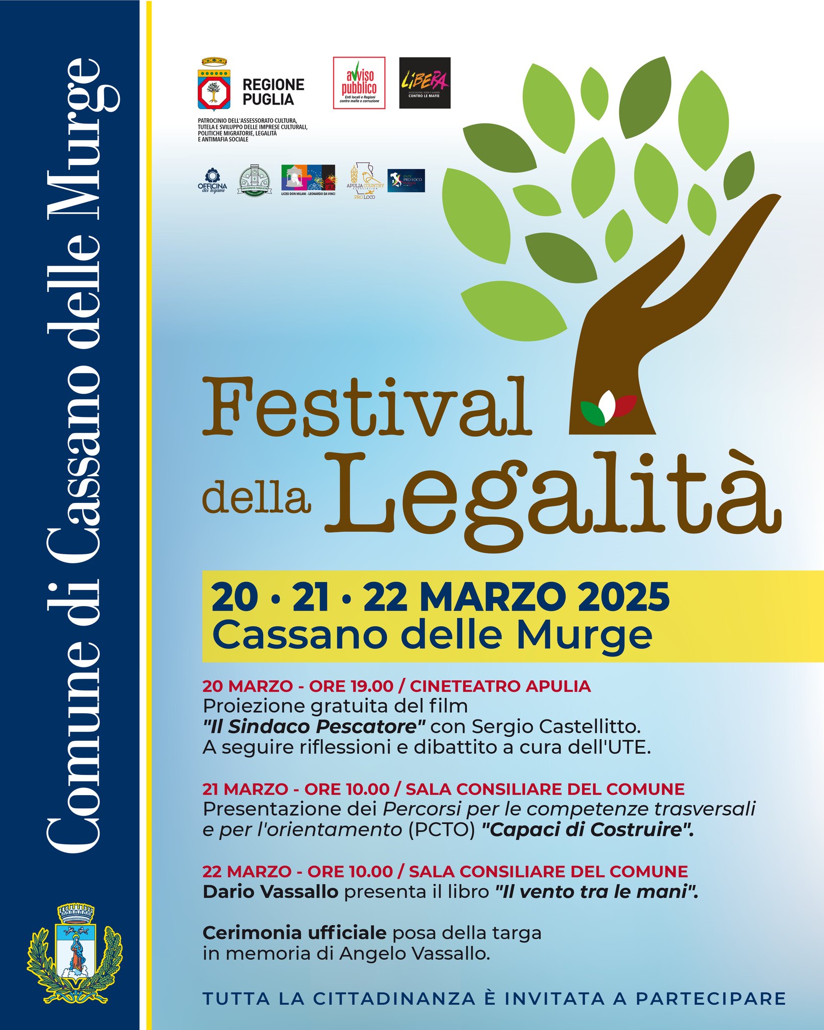 In occasione della 30° Giornata della memoria e dell’impegno in ricordo delle vittime innocenti delle mafie, il Comune di Cassano delle Murge rinnova il suo impegno per una comunità più giusta, libera e consapevole con la promozione del “Festival della Legalità”, una tre giorni di cinema, dibattiti e testimonianze per affermare che la legalità non è solo un principio, ma una scelta quotidiana.