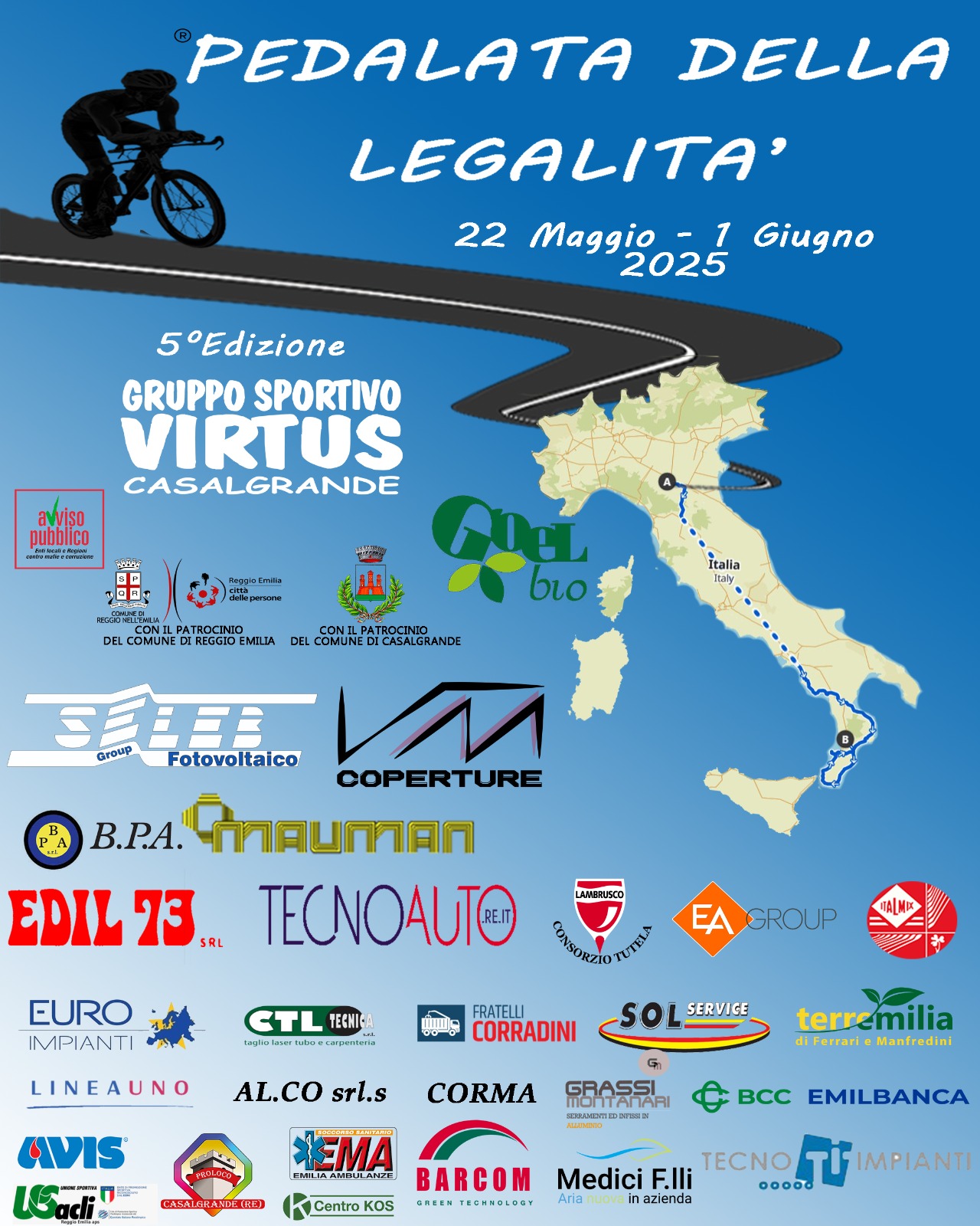 Il 22 Maggio 2025, dalle 08:00 a casalgrande in provincia di reggio emilia, GRUPPO SPORTIVO VIRTUS CASALGRANDE organizza “Dal 23 maggio al 1 giugno la 5° edizione della Pedalata della Legalità promossa dal Comune di Casalgrande”.