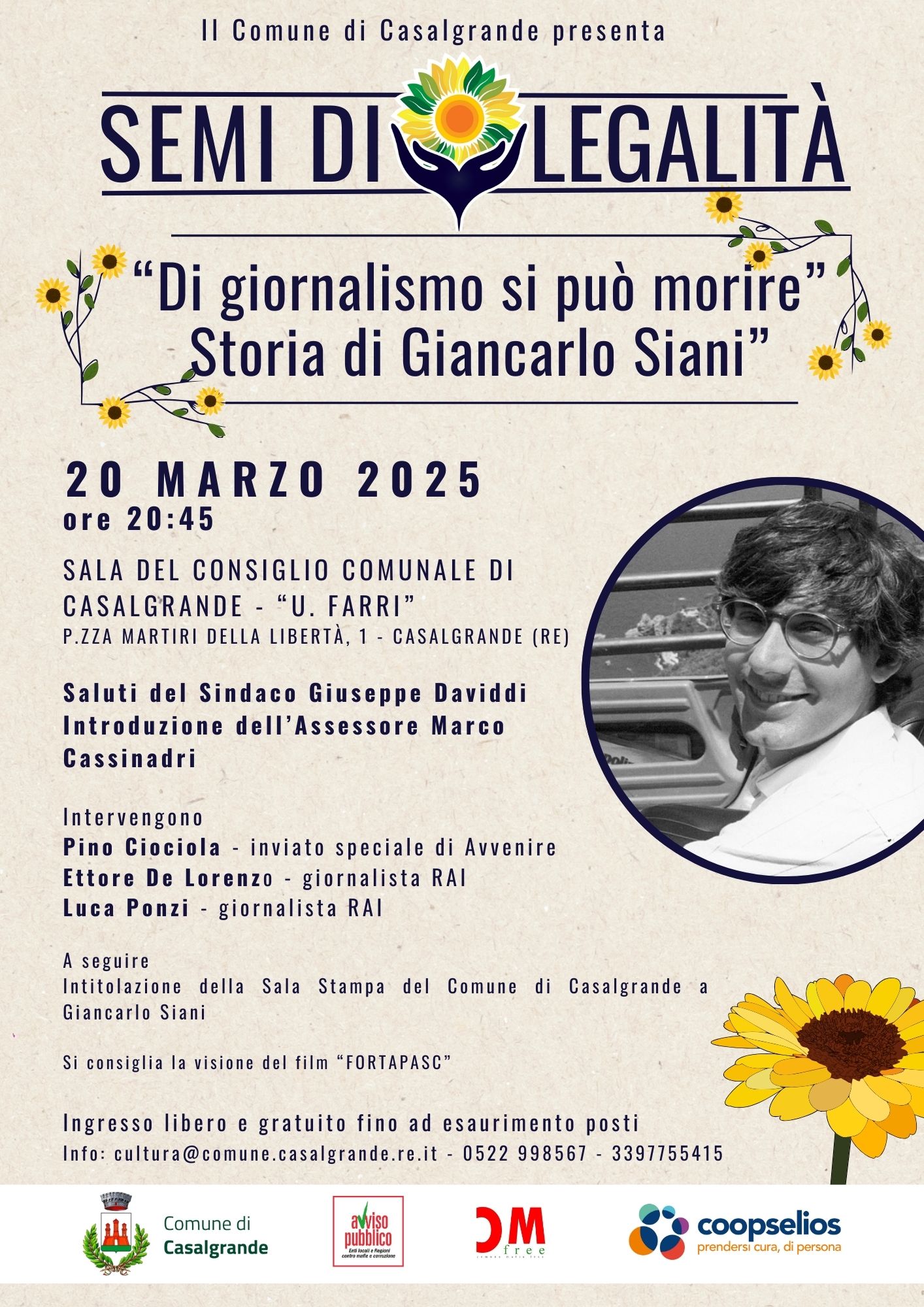 Mercoledì 20 marzo, dalle 20:30 alle 23:00, l’amministrazione comunale Calsalgrande organizza l’incontro “Di giornalismo di può morire. Storia di Giancarlo Siani”. Al termine dell’evento verrà intitolata la Sala stampa del Comune al giornalista campano ucciso dalla camorra.