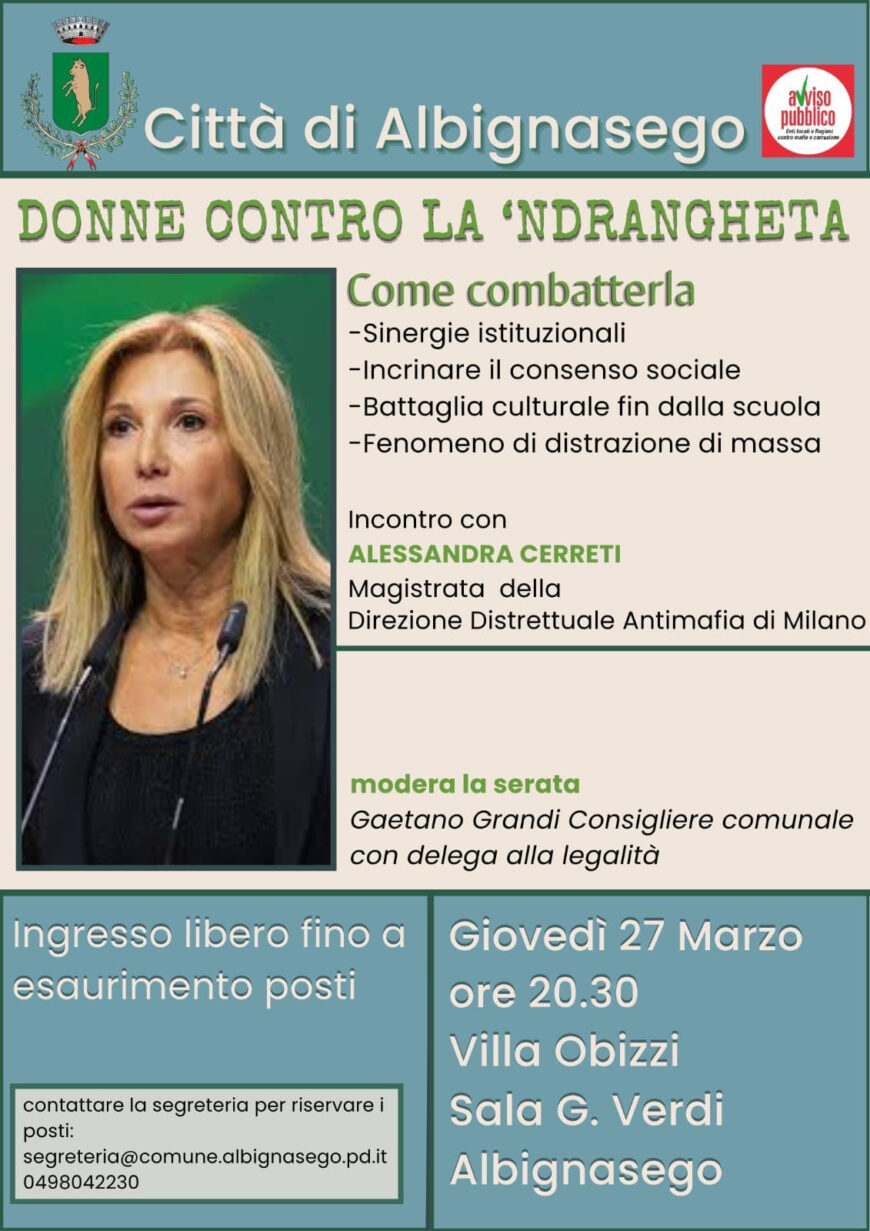 Il Comune di Albignasego, in provincia di Padova, promuove l’incontro pubblico “Donne contro la ‘ndrangheta”.