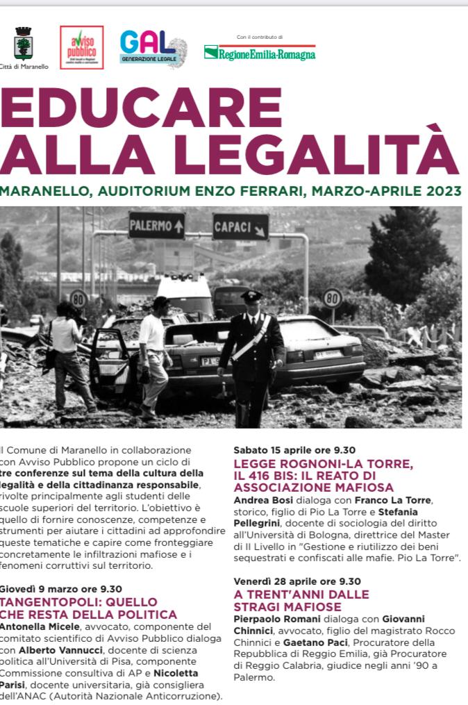 Si conclude venerdì 28 aprile il ciclo di incontri “Educare alla legalità”, promossi dal Comune di Maranello in collaborazione con Avviso Pubblico: tre conferenze sul tema della cultura della legalità e della cittadinanza responsabile, rivolte principalmente agli studenti delle scuole superiori del territorio con l’obiettivo di fornire conoscenze, competenze e strumenti per aiutare i cittadini ad approfondire queste tematiche e capire come fronteggiare concretamente le infiltrazioni mafiose e i fenomeni corruttivi sul territorio.