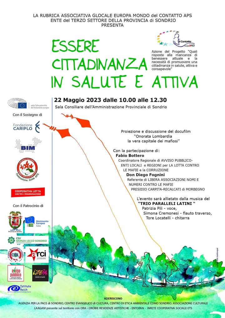 L’appuntamento è per lunedì 22 maggio dalle 10.00 alle 12.30, presso la Sala consiliare dell’Amministrazione provinciale di Sondrio, con l’incontro “Essere cittadinanza in salute e attiva”. All’evento, patrocinato anche da Avviso Pubblico, aderiscono “Agenzia per la pace di Sondrio”, “Centro evangelico di cultura”, “Centro di etica ambientale Como Sondrio”, “Associazione culturale LAAGAM”, presente sul territorio con “ORA” – Orobia residenze artistiche – “ENTOPAN”- “INRETE Cooperativa sociale ETS”.