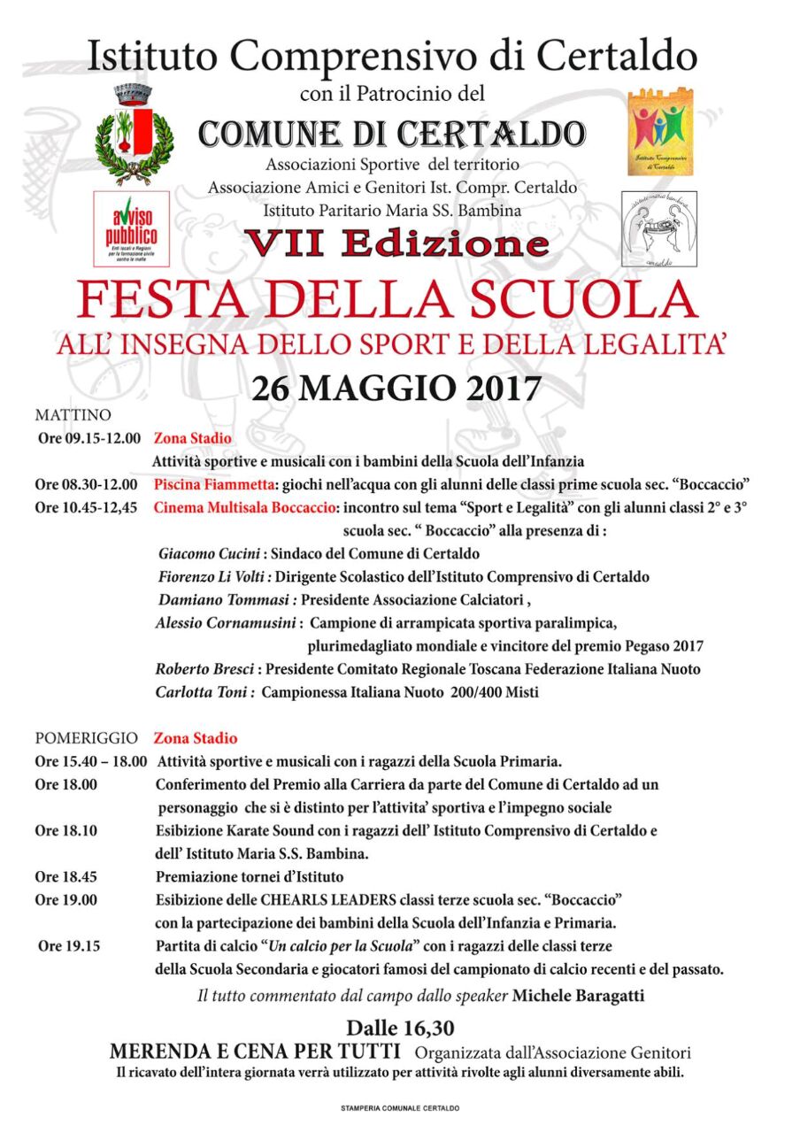 L’Istituto Comprensivo di Certaldo con il Patrocinio del Comune di Certaldo, di Avviso Pubblico, delle Associazioni Sportive del territorio, dell’Associazione Amici e Genitori Ist. Compr. Certaldo, dell’Istituto Paritario Maria SS. Bambina organizza la VII Edizione della Festa della Scuola all’insegna dello sport e della legalità. La manifestazione si terrà il 26 maggio 2017 a Certaldo.