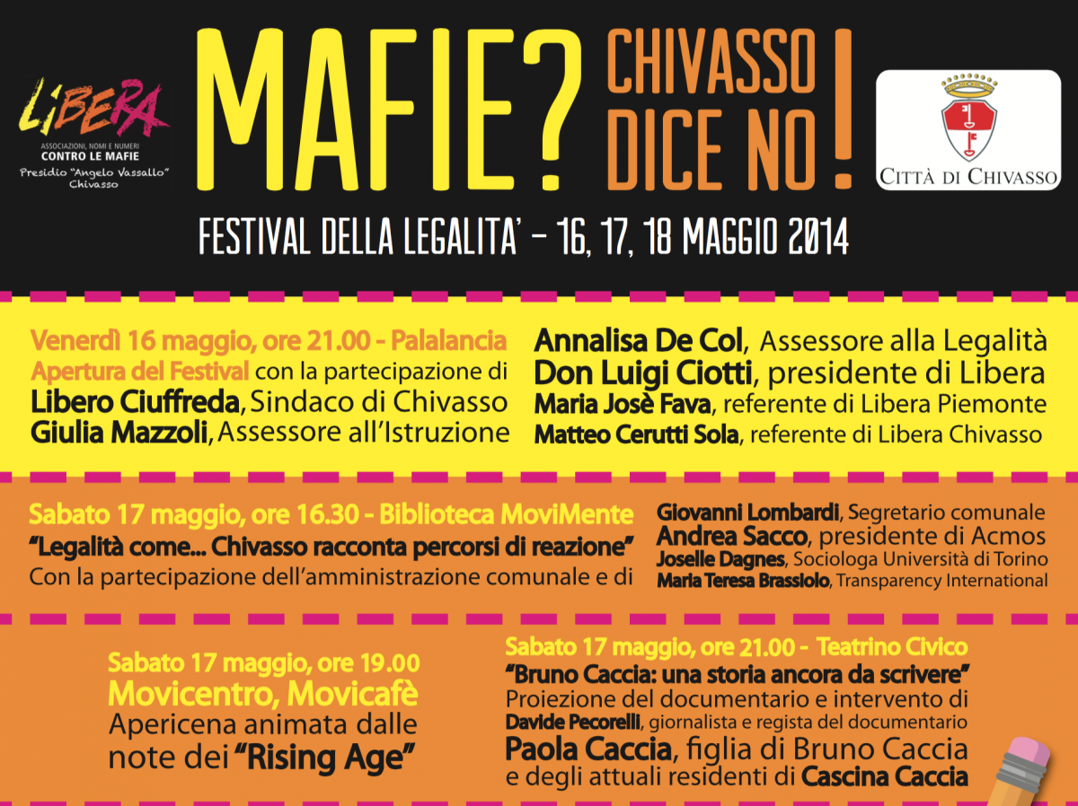 L’iniziativa organizzata dal Comune di Chivasso, ente socio di Avviso Pubblico, e da Libera, in collaborazione anche con Avviso Pubblico, che si svolgerà l’8, il 9 ed il 10 maggio 2015 in varie parti della città, fa parte di un più articolato progetto che si sviluppa durante l’intero anno.