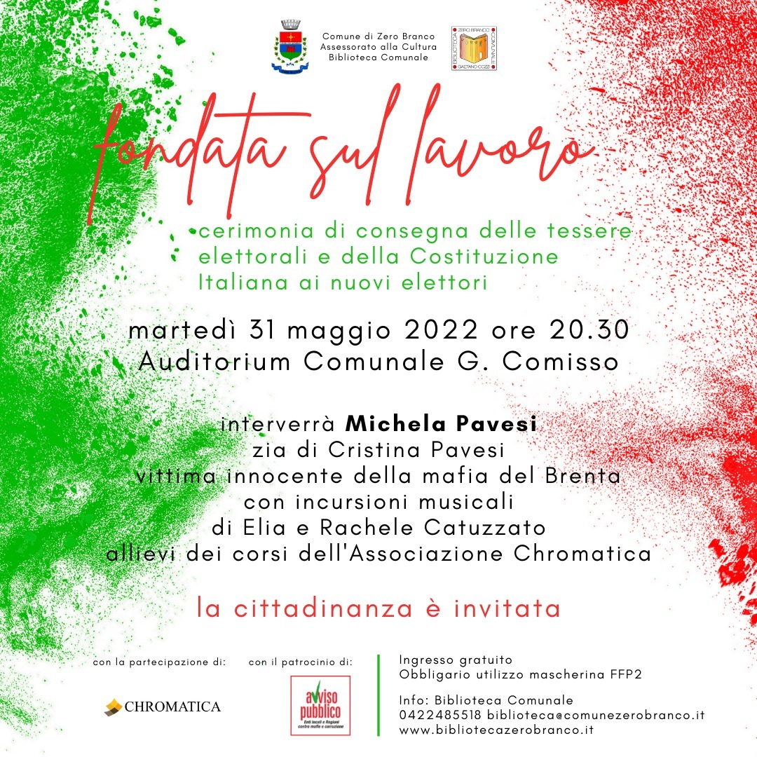 L’evento, dal titolo “Fondata sul lavoro”, che richiama il primo articolo della Costituzione, è previsto per martedì 31 maggio alle 20.30 all’Auditorium comunale G.Comisso. ed è organizzato in collaborazione con l’Associazione Chromatica e con il patrocinio di Avviso Pubblico.
