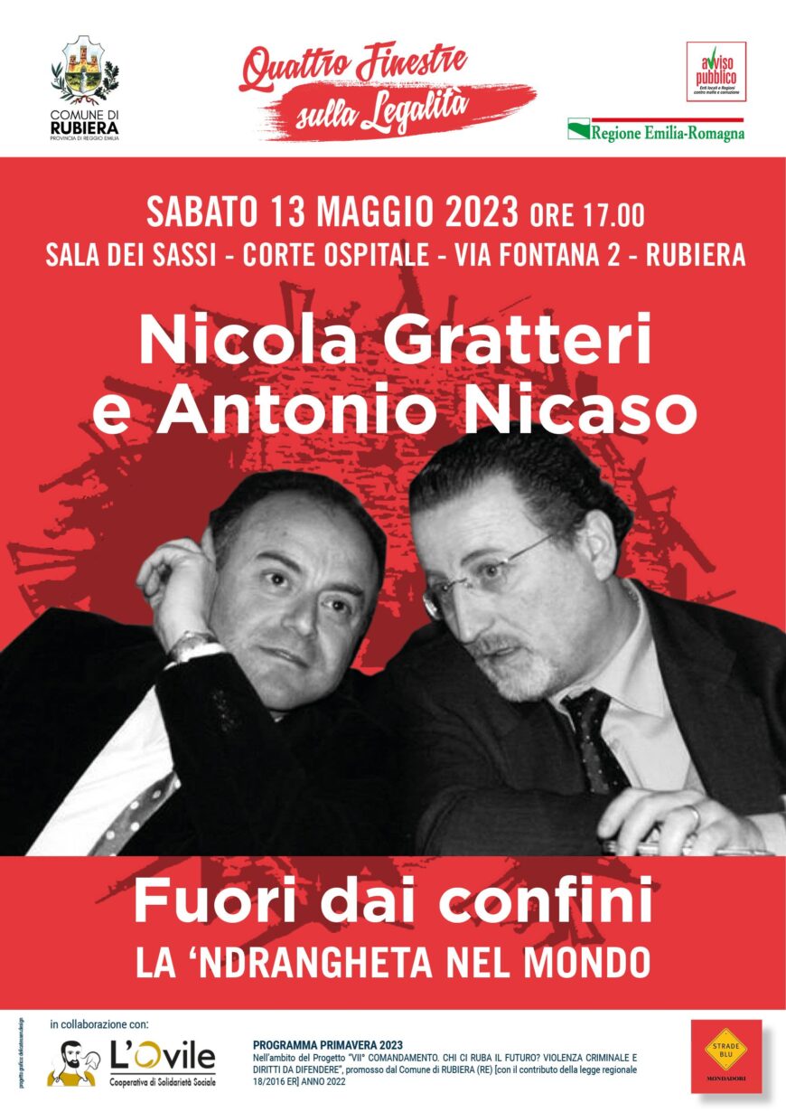 Il Comune di Rubiera, Reggio Emilia, organizza per sabato 13 maggio alle 17.00, presso la Sala dei Sassi, Corte Ospitale, la presentazione del libro “Fuori dai confini – La ‘ndrangheta nel mondo” di Nicola Gratteri e Antonio Nicaso (Mondadori, 2022). L’evento è patrocinato da Avviso Pubblico.