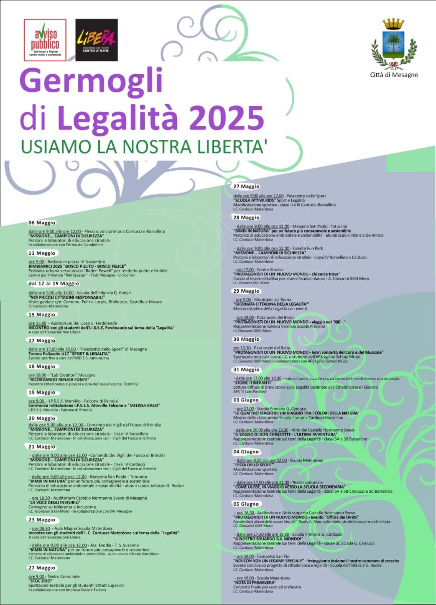 “Promuovere attivamente la cultura della legalità, prevenire e contrastare i fenomeni criminosi e rafforzare la sicurezza del nostro territorio: con questi obiettivi primari, e in linea con la tradizione che vede maggio come mese dedicato alla riflessione comunitaria sui diritti costituzionali”, la Giunta del Comune di Mesagne promuove la rassegna culturale “Germogli di Legalità – Usiamo la nostra Libertà”, dal 5 maggio al 5 giugno.