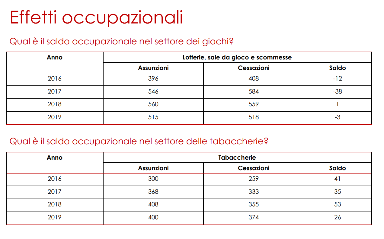 Calo occupazione nel settore in linea con il resto del mercato del lavoro. “I dati dell’Osservatorio regionale sul mercato del lavoro del Piemonte mostrano l’andamento delle assunzioni e delle cessazioni dell’occupazione dipendente nei settori di riferimento – si evidenzia nella Relazione – Per quanto riguarda le tabaccherie il dato è abbastanza stabile e nei quattro anni il saldo complessivo è positivo. Invece, sul versante sale da gioco, nei quattro anni si registra un saldo leggermente negativo, ma in linea con il resto del mercato del lavoro.”
