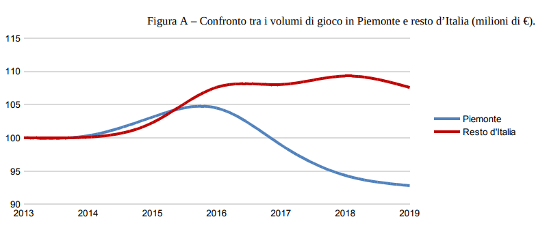 “Escludendo gli apparecchi, tutti gli altri giochi fisici in Piemonte sono cresciuti nel 2019 di 321 milioni di euro, pari ad un +21,9%, mentre nel resto d’Italia l’aumento è stato pari al 8,4%. Tuttavia la diminuzione del gioco legato agli apparecchi nello stesso periodo è stata pari a 893 milioni di Euro, quasi tre volte più grande della crescita degli altri giochi fisici. La crescita degli altri tipi di gioco non ha dunque neutralizzato l’effetto che la legge regionale ha avuto su slot machine”.