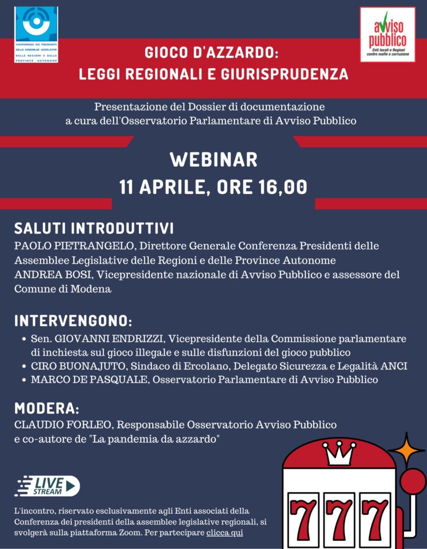 L’appuntamento è per lunedì 11 aprile alle ore 16,00 in live streaming con l’incontro “Gioco d’azzardo: leggi regionali e giurisprudenza”. Per l’occasione verrà presentato il Dossier di documentazione a cura dell’Osservatorio Parlamentare di Avviso Pubblico.