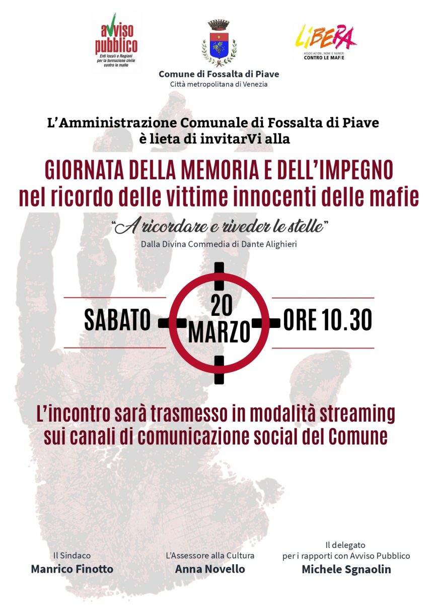 L’Amministrazione Comunale di Fossalta di Piave (VE), organizza in occasione della XXVI Giornata della memoria e dell’impegno in ricordo delle vittime innocenti delle mafie, in collaborazione con Avviso Pubblico per il giorno sabato 20 marzo, alle ore 10.30, in diretta streaming sui canali social del comune un importante incontro di memoria.