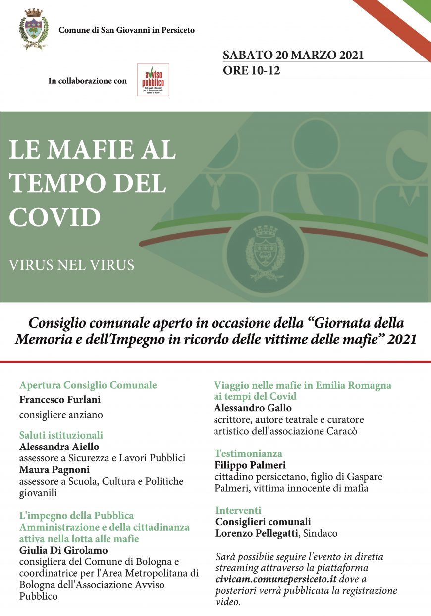 Sabato 20 marzo, alle ore 10.00, in videoconferenza, si svolgerà un Consiglio Comunale aperto dal titolo “Le Mafie al Tempo del Covid. Virus nel Virus”.