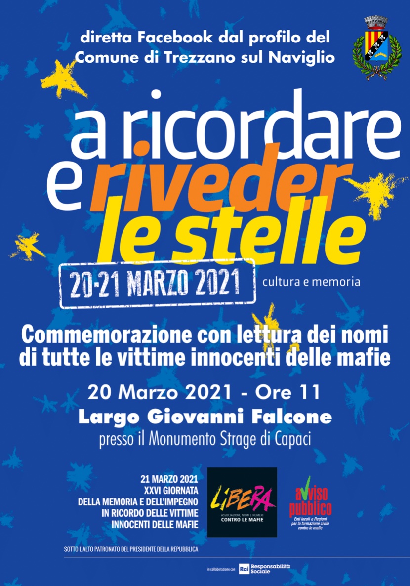 In occasione della celebrazione della XXVI Giornata della memoria e dell’impegno in ricordo delle vittime delle mafie, promossa da Libera e Avviso Pubblico e dal 2017 ufficialmente riconosciuta da una legge dello Stato, il Comune di Trezzano sul Naviglio (Mi) organizza, in collaborazione con Avviso Pubblico, in diretta sulla pagina Facebook del Comune, sabato 20 marzo, alle ore 11,00, presso il Monumento Stragi di Capaci, in Largo Giovanni Falcone, la lettura dei nomi di tutte le vittime innocenti delle mafie.
