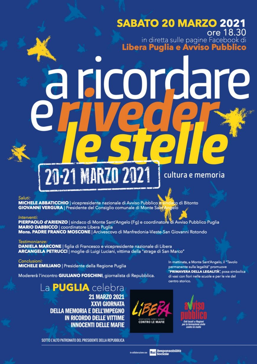 “A ricordare e riveder le stelle” è il tema di questa speciale edizione che si celebra dal 1996, il 21 marzo di ogni anno, primo giorno di primavera, con Avviso Pubblico e Libera che ricordano le vittime innocenti delle mafie, dalla fine dell’800 ad oggi, di cui si è riusciti a ricostruire la storia.