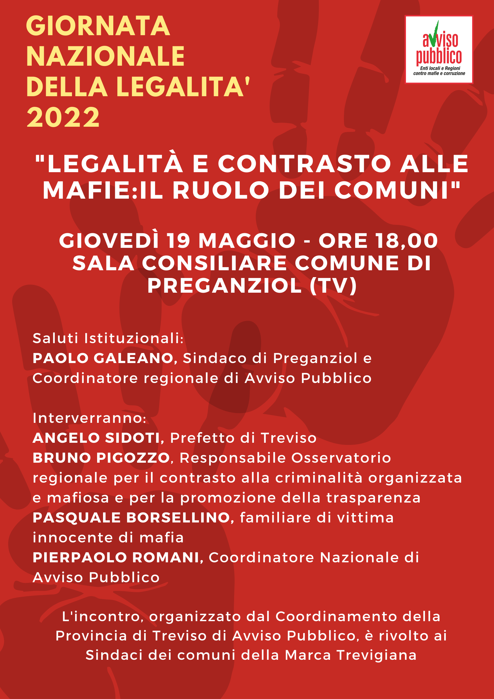 Il Coordinamento della Provincia di Treviso di Avviso Pubblico organizza giovedì 20 maggio alle ore 18.00, presso la Sala consiliare della città in occasione della “Giornata nazionale della Legalità 2022”, un incontro rivolto ai sindaci dei comuni della Marca Trevigiana.