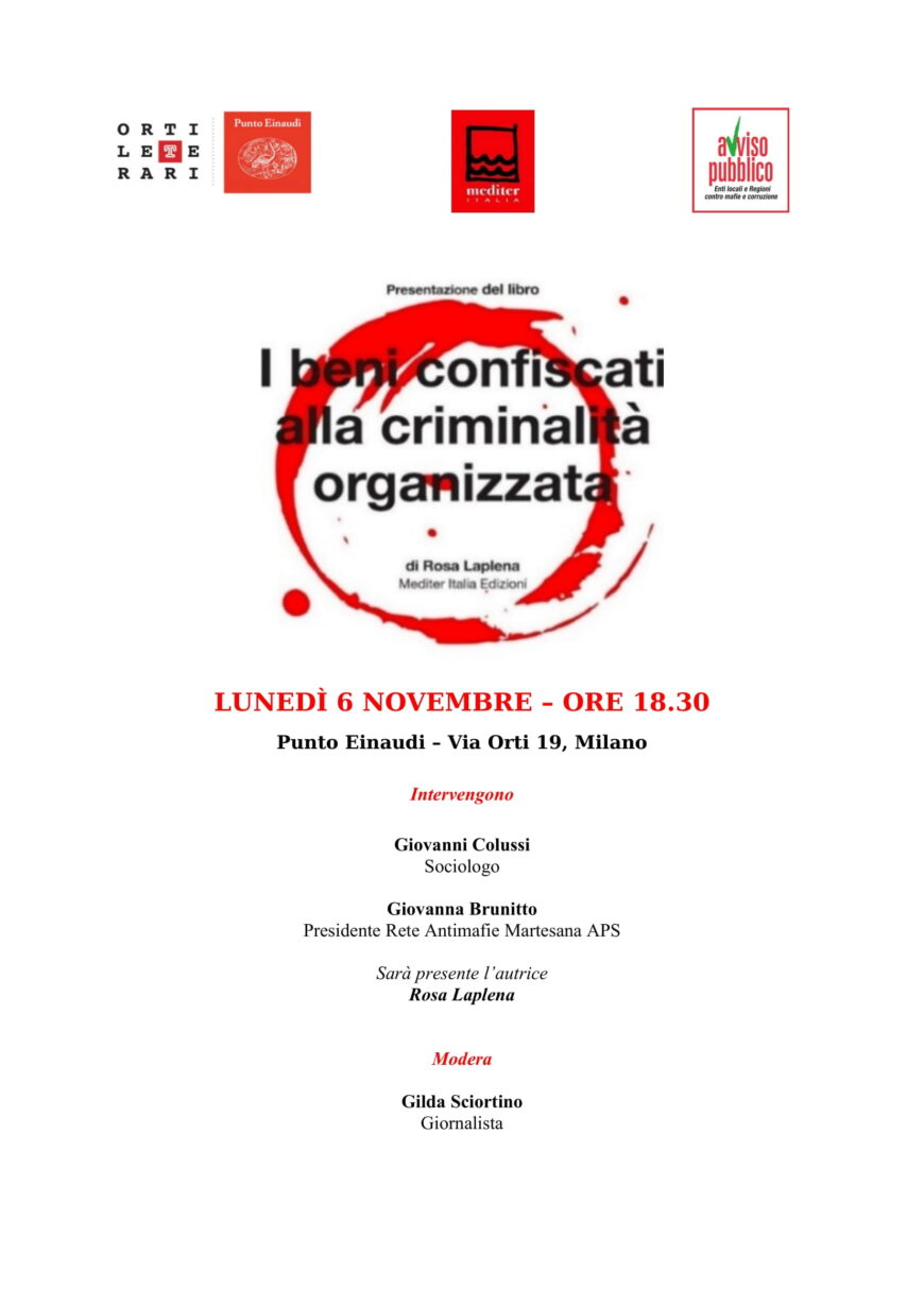 L’appuntamento è per lunedì 6 novembre alle 18.30 presso il Punto Einaudi, in Via Orti 19 a Milano con la presentazione del libro “I beni confiscati alla criminalità” di Rosa Laplena. L’evento è patrocinato da Avviso Pubblico.