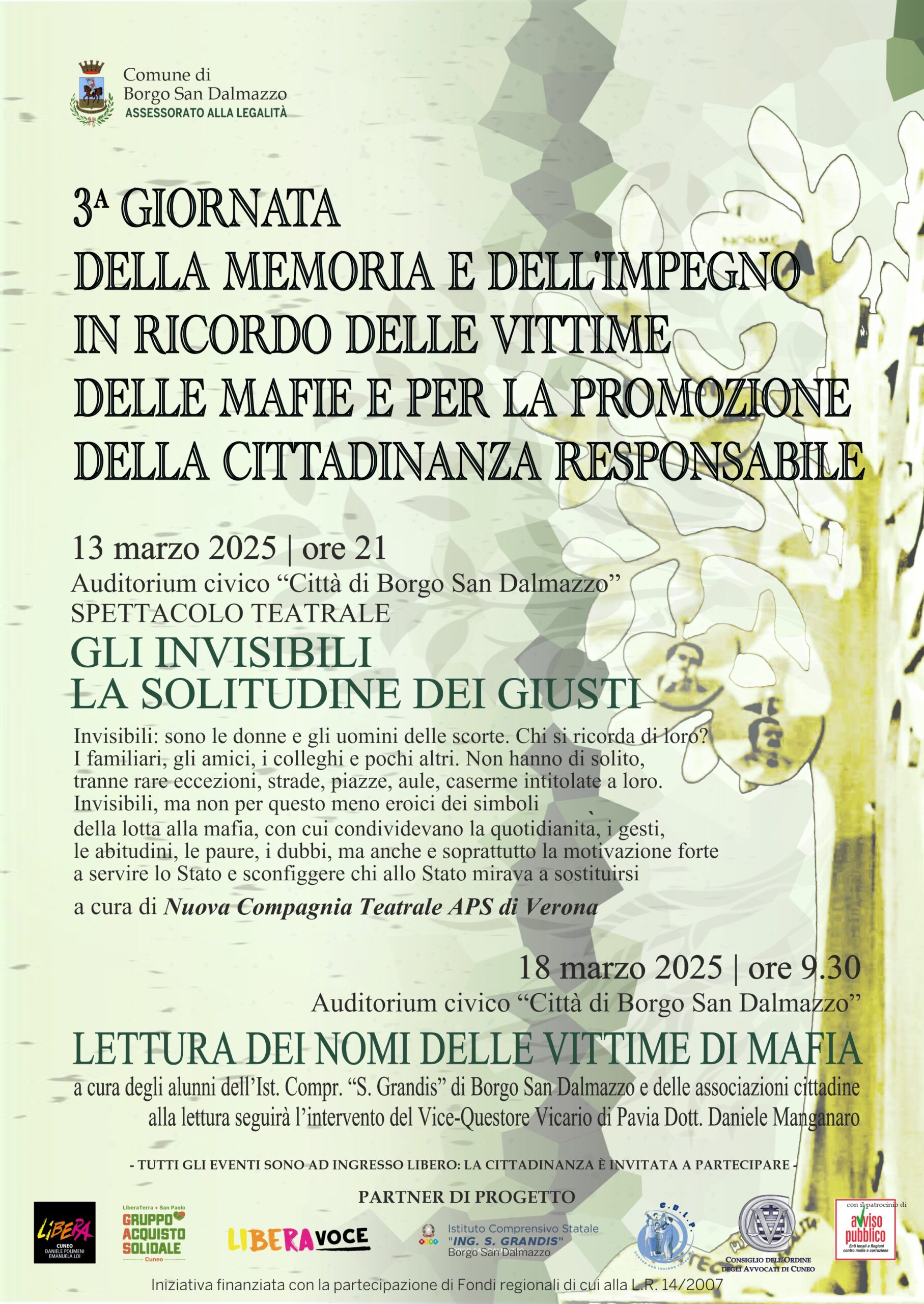 In occasione della 30° Giornata della memoria e dell’impegno in ricordo delle vittime innocenti delle mafie, il Comune di Borgo San Dalmazzo promuove alcune iniziative per la 3° Giornata cittadina della memoria e per la promozione della cittadinanza responsabile.
