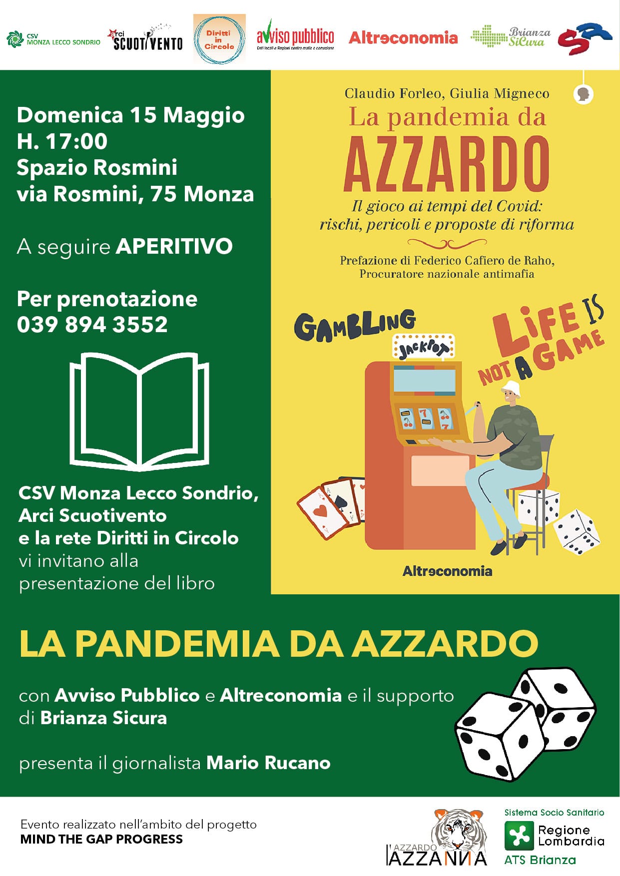 Il CSV Monza Lecco Sondrio con sede Monza e BrianzaDiritti in CircoloArci Scuotivento Monza e la rete Diritti in Circolo e il supporto di Brianza Sicura, organizzano per domenica 15 maggio, alle ore 17.00, presso lo Spazio Rosmini, via Rosmini 75, a Monza, la presentazione del libro di Avviso Pubblico “Pandemia da azzardo – Il gioco ai tempi del covid: rischi, pericoli e proposte di riforma” (Altreconomia, 2021), scritto da Giulia Migneco Claudio Forleo.