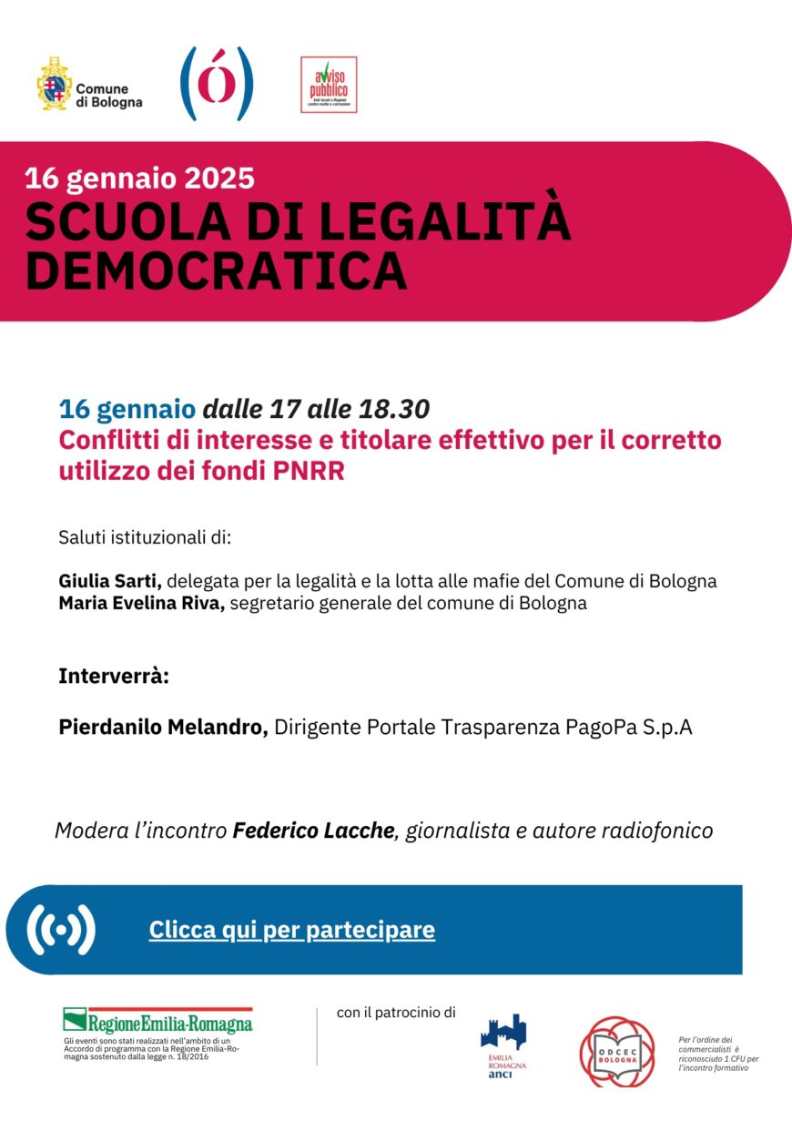Giovedì 16 gennaio dalle 17 alle 18.30 riprendono gli incontri online del progetto di formazione promosso da Avviso Pubblico con il Comune di Bologna.
