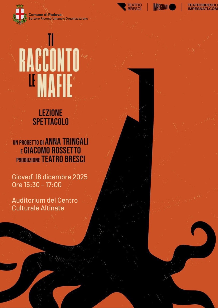 Giovedì 18 dicembre 2025, alle ore 15.30, presso l’Auditorium del Centro Culturale Altinate di Padova, andrà in scena lo spettacolo teatrale “Ti racconto le mafie”, un progetto di Anna Tringali e Giacomo Rossetto, prodotto da Teatro Bresci.