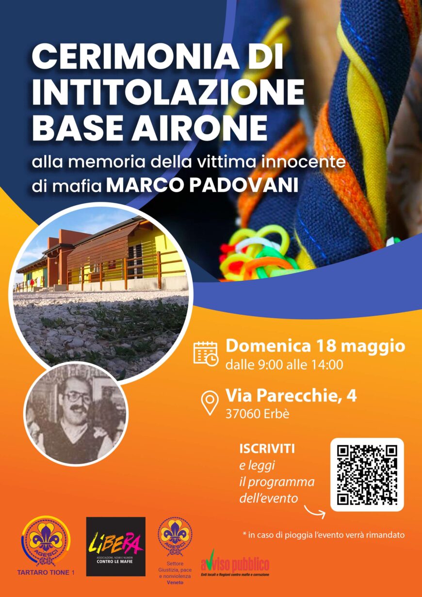 Il 18 Maggio 2025, dalle 09:00 alle 13:30, a Erbè in provincia di Verona, l’Agesci gruppo scout Tartaro Tione 1 organizza la cerimonia di “Intitolazione della base scout Airone alla vittima innocente di mafia Marco Padovani”.