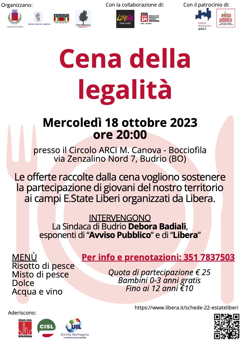 Il Comune di Budrio, in provincia di Bologna, il circolo Arci M.Canova, l’Anpi e il Centro sociale e culturale la Magnolia, organizzano per mercoledì 18 ottobre alle 20, presso il Circolo Arci M. Canova di Budrio, a “Cena della Legalità” a sostegno della partecipazione dei giovani ai campi E.State Liberi per il 2024.