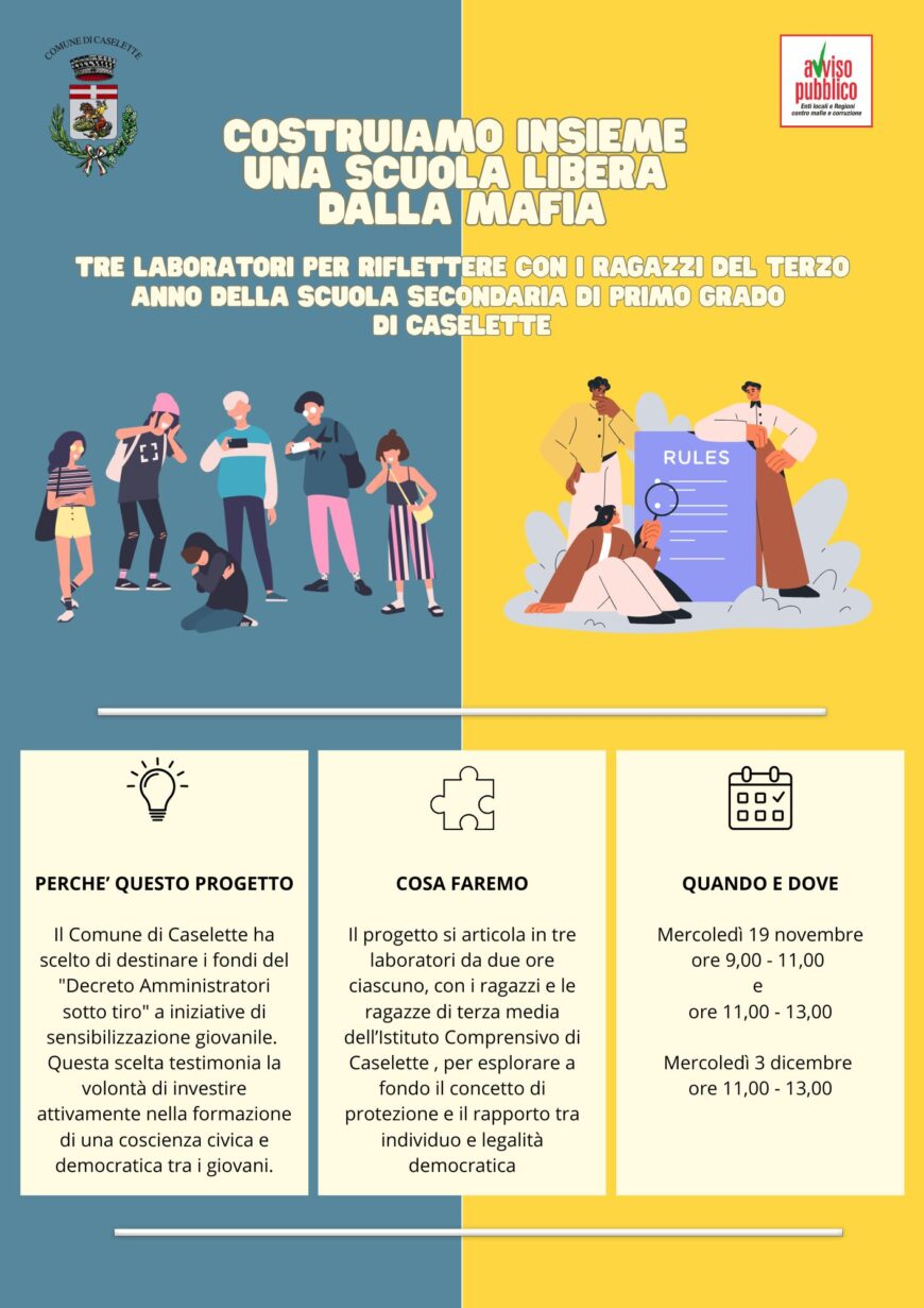 Mercoledì 19 novembre (ore 9.00-11.00 e 11.00-13.00) e mercoledì 3 dicembre (ore 11.00-13.30) prenderanno il via i tre laboratori del percorso “Costruiamo insieme una scuola libera dalla mafia”, promossi dal Comune di Caselette in collaborazione con Avviso Pubblico.