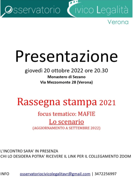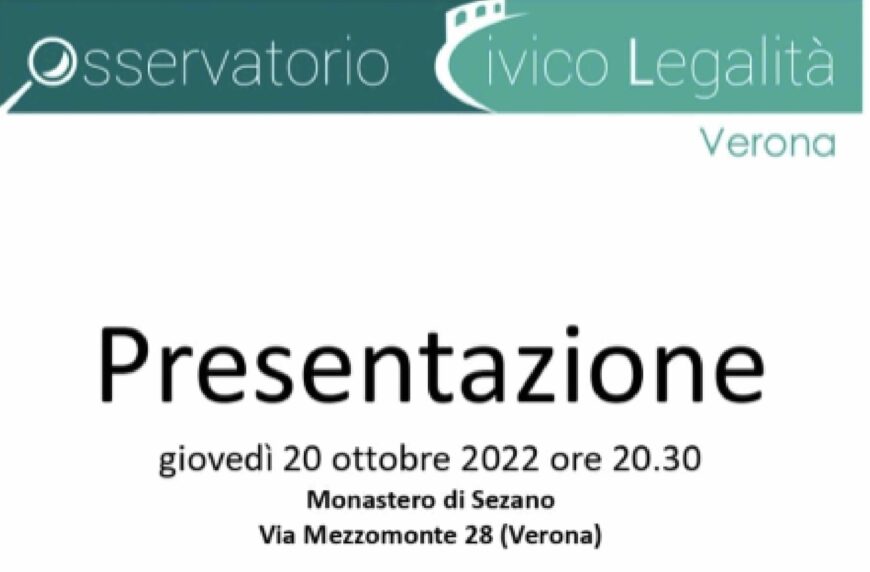 L’associazione “Monastero del Bene Comune” di Sezano, in provincia di Verona, presenta il nuovo Rapporto Osservatorio Mafie 2021, realizzato da “Osservatorio Civico Legalità Verona” e che raccoglie le notizie sul tema delle criminalità organizzate nel territorio scaligero. Uno strumento di grande aiuto per capire lo scenario nel quale il territorio è chiamato ad operare.