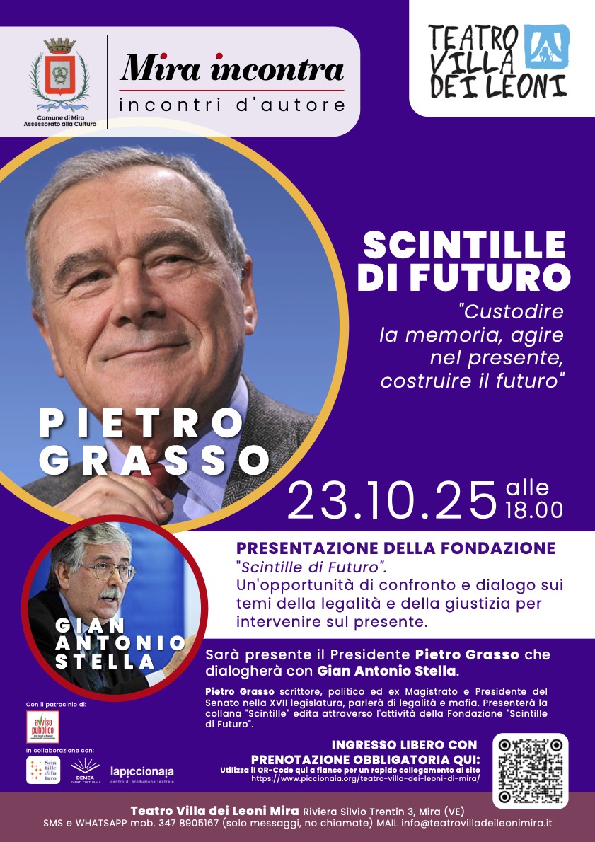 Giovedì 23 ottobre dalle 18:00 alle 19:30 il Comune di Mira organizza un incontro pubblico per presentare la Fondazione “Scintille di futuro”, con Pietro Grasso e Gian Antonio Stella”.