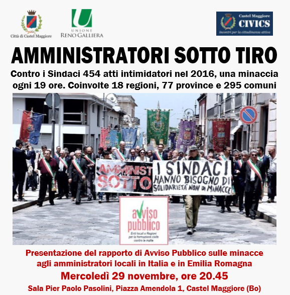 Si terrà il 29 novembre a Castel Maggiore (Bo), alle ore 20.45 presso la Sala Pier Paolo Pasolini (piazza Amendola 1) la presentazione del Rapporto “Amministratori sotto tiro 2016”, il report che Avviso Pubblico realizza dal 2011 sul numero delle intimidazioni e minacce rivolte a sindaci, assessori, consiglieri e personale della Pubblica Amministrazione.