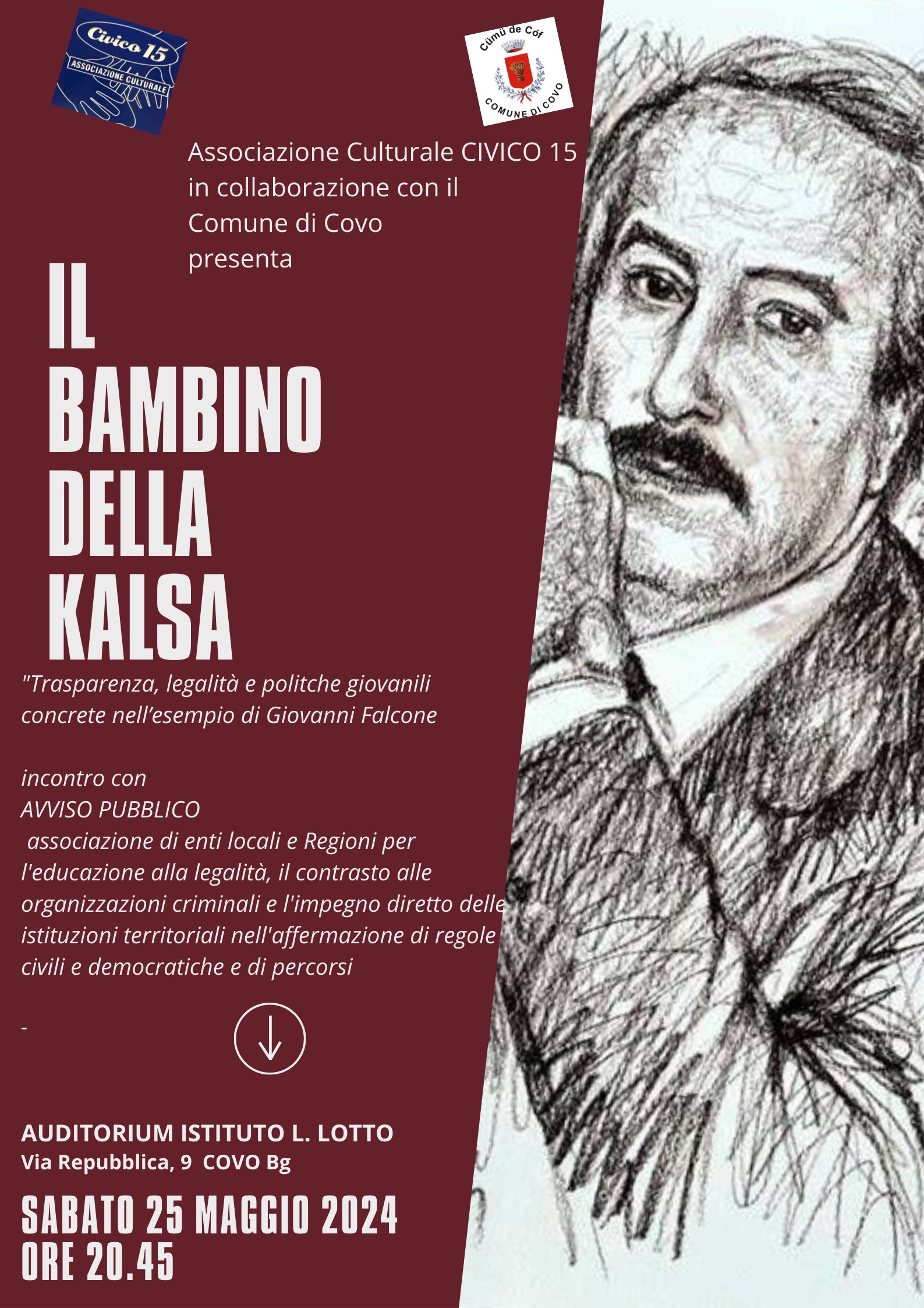 Ad organizzare l’evento dal titolo “Il bambino della Kalsa” è l‘Associazione Culturale CIVICO 15, in collaborazione con il Comune di Covo. L’appuntamento è sabato 25 maggio alle 20.45, presso l’Auditorium dell’Istituto L. Lotto di Covo, in via della Repubblica 9.