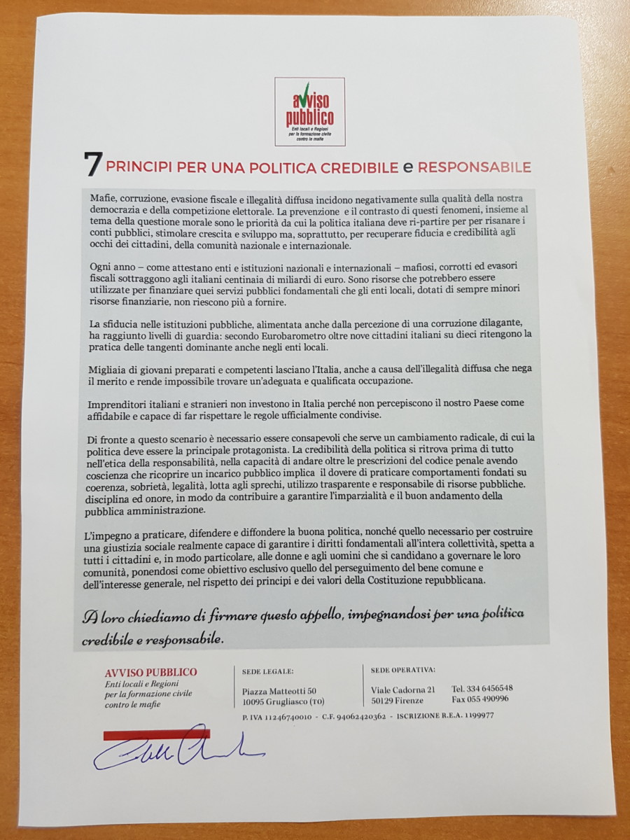 Avviso Pubblico ringrazia Claudio Castello e i 48 candidati della sua coalizione per aver sottoscritto e aderito al nostro Appello Per una Politica Credibile e Responsabile e auspica che anche altri candidati e candidate alle prossime Elezioni Amministrative seguano il loro esempio.