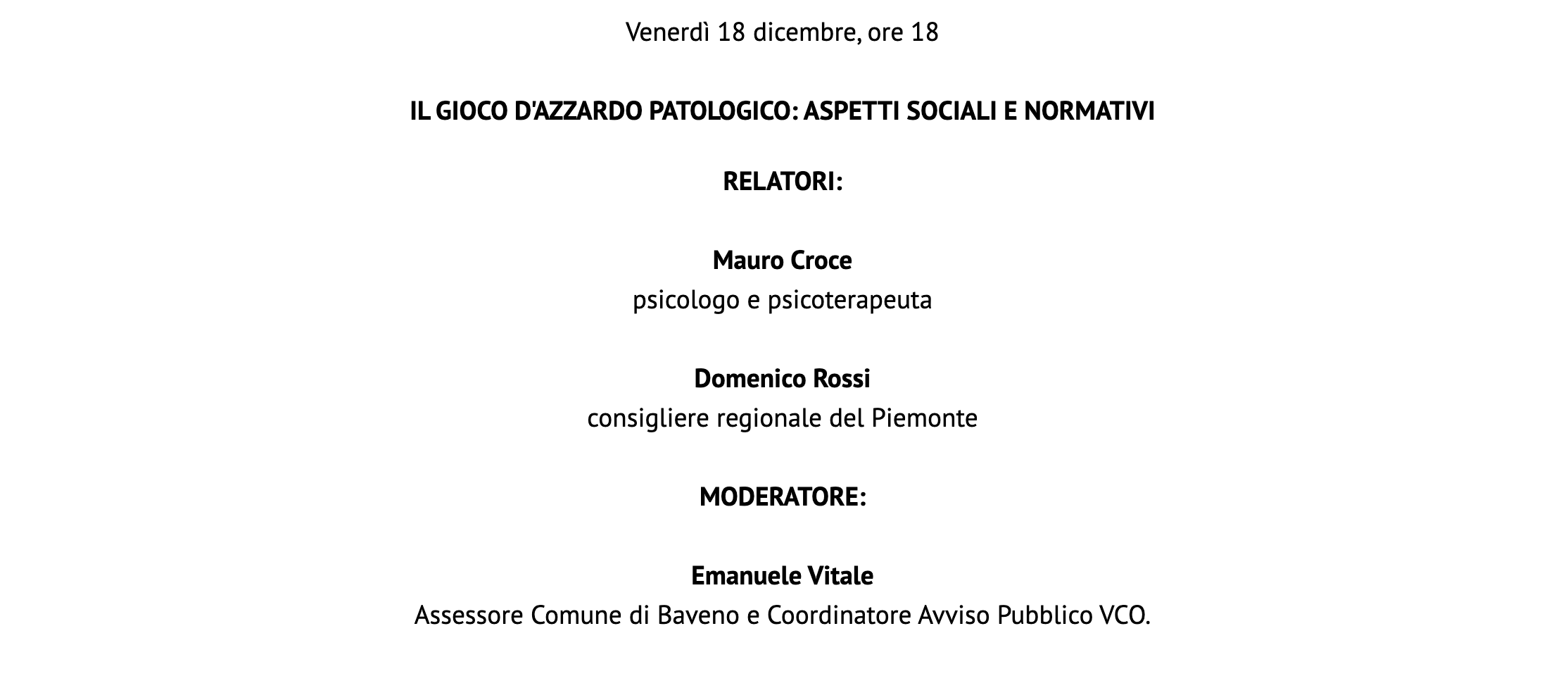 “IL GIOCO D’AZZARDO PATOLOGICO: ASPETTI SOCIALI E NORMATIVI”: IL 18 DICEMBRE AVVISO PUBBLICO PARTECIPA ALL’INCONTRO PROMOSSO DAL COMUNE DI VERBANIA