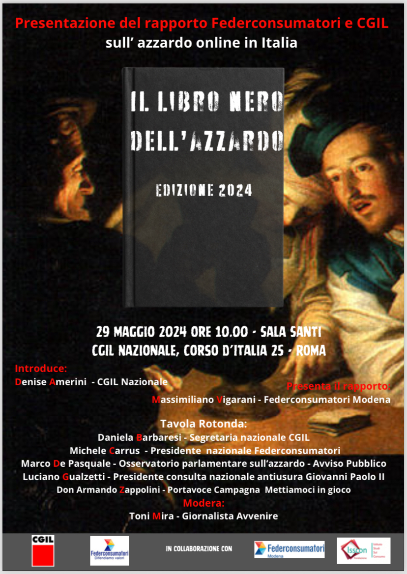 Federconsumatori e Cgil presentano il nuovo rapporto sull’azzardo online in Italia. “Il libro nero dell’azzardo 2024” sarà al centro di una tavola rotonda a Roma, mercoledì 29 maggio alle 10.00, presso la Sala Santi della Cgil Nazionale, in Corso Italia 25. Per Avviso Pubblico sarà presente Marco De Pasquale dell’Osservatorio parlamentare dell’Associazione.