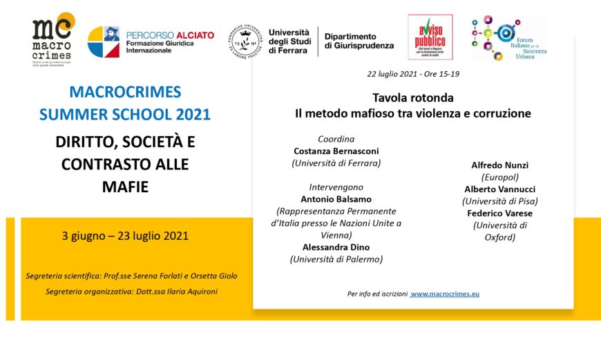 L’incontro, dal titolo “Il metodo mafioso tra violenza e corruzione”, sarà coordinato da Costanza Bernasconi dell’Università di Ferrara e vedrà come relatori: