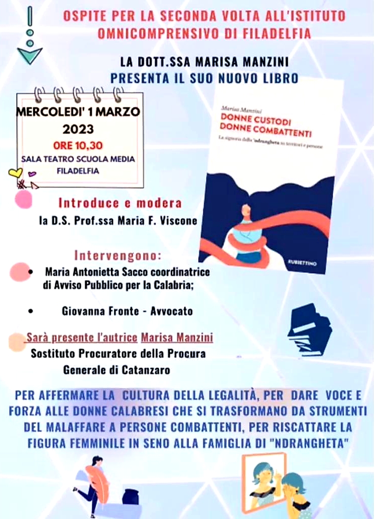 L’Istituto onnicomprensivo di Filadelfia organizza per mercoledì 1 marzo alle 10.30 presso la Sala teatro della scuola media, la presentazione del libro “Donne custodi, donne combattenti – La signoria della ‘ndrangheta su territori e persone” (Rubettino Editore, 2022) di Marisa Manzini, Sostituto Procuratore della Procura Generale di Catanzaro.