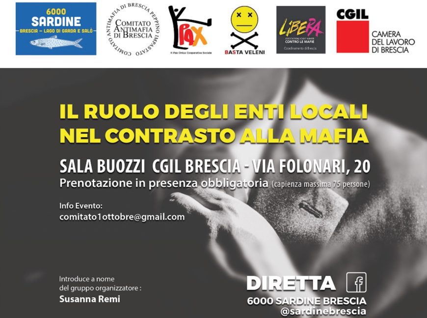 L’appuntamento è a Brescia per venerdì 1 ottobre alle ore 20.30, presso la Sala Buozzi in via Folonari 20 e riguarda tutti i sindaci della provincia, invitati a partecipare ad un incontro finalizzato alla creazione di osservatori territoriali antimafia. Sono già una ventina quelli che hanno già assicurato la loro presenza.
