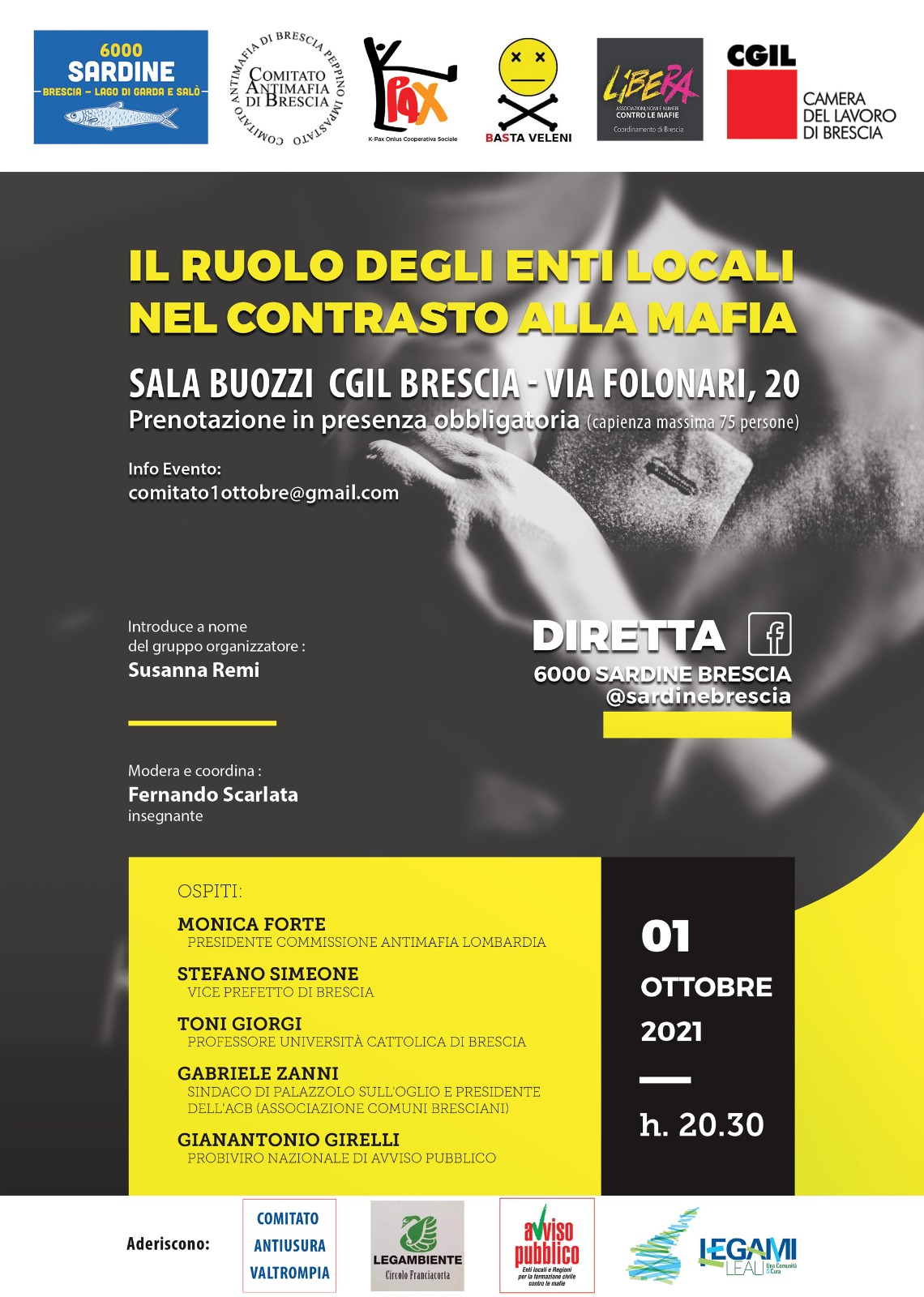 Per l’occasione, dopo l’introduzione di Susanna Remi a nome del gruppo organizzatore, coordinati e moderati da Fernando Scarlata (coordinatore bresciano del Comitato Antimafia “Peppino Impastato), interverranno Monica Forte (Presidente Commissione Antimafia Lombarda), Stefano Simeone (Viceprefetto di Brescia), Toni Giorgi (Docente Università Cattolica di Brescia), Gabriele Zanni (Sindaco di Palazzolo sull’Oglio e presidente dell’Acb). Per Avviso Pubblico parteciperà Gianantonio Girelli, membro del comitato nazionale dei probiviri dell’associazione.