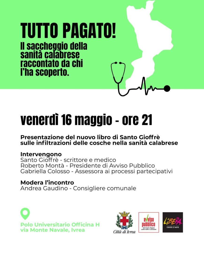 L’iniziativa, che avrà luogo venerdì 16 maggio 2025 alle ore 21 presso il Polo Universitario Officina H, in via Monte Navale, prevede la presentazione del nuovo libro di Santo Gioffrè “TUTTO PAGATO! Il saccheggio della sanità calabrese raccontato da chi l’ha scoperto”.