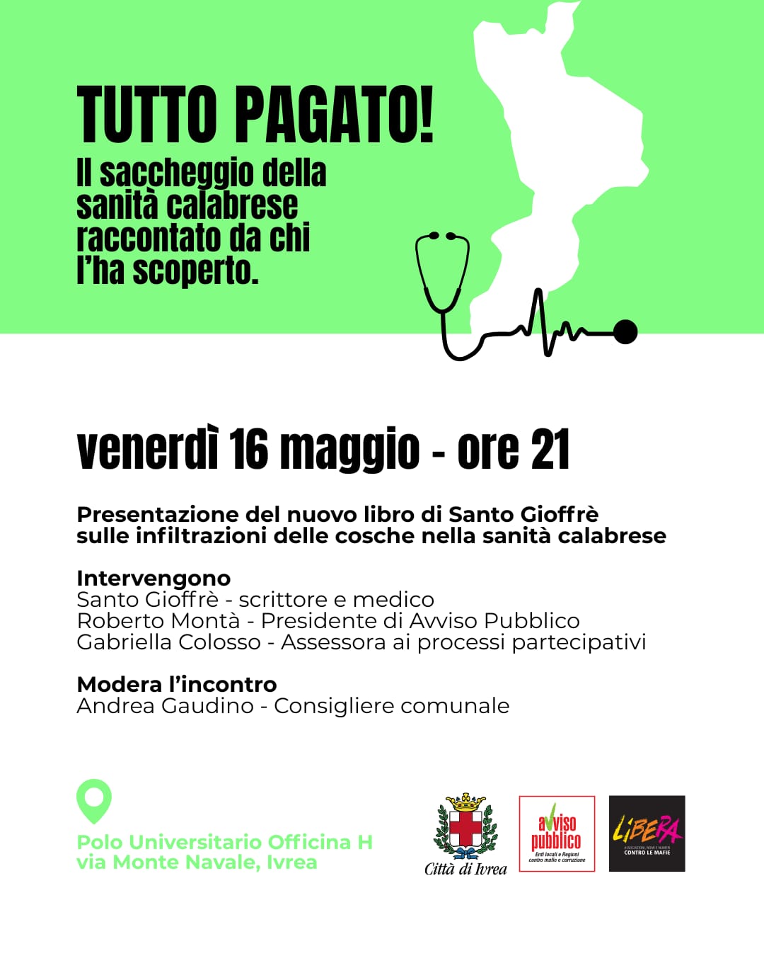 Nell’ambito delle iniziative di sensibilizzazione sui temi della corruzione e della criminalità organizzata, il Comune di Ivrea organizza un incontro di approfondimento sulle infiltrazioni delle cosche nella sanità calabrese, in collaborazione con le associazioni Libera e Avviso Pubblico.