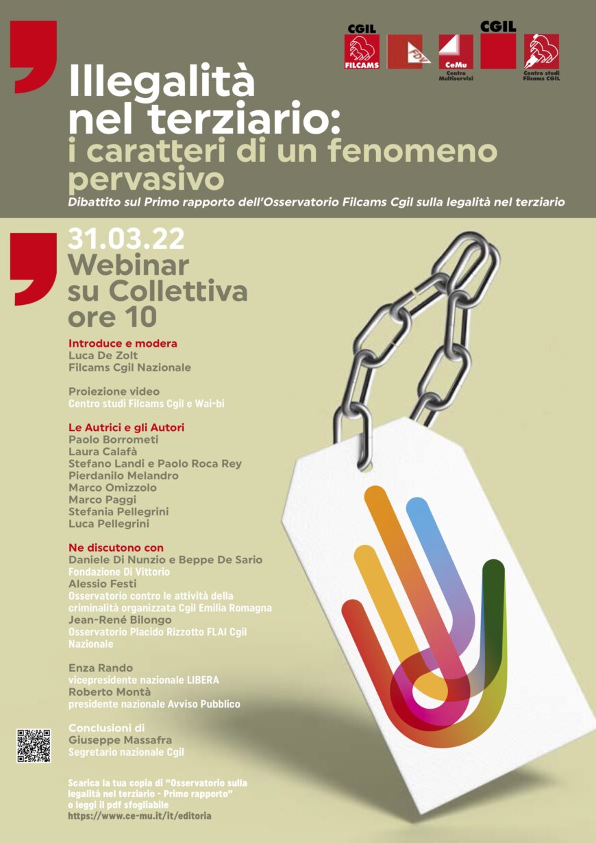 Si apre il 31 marzo, alle ore 10,00, il webinar su Collettiva, la piattaforma della Cgil, il dibattito sul Primo rapporto dell’Osservatorio Filcams Cgil sulla legalità nel terziario, nell’ambito dell’incontro “Illegalità nel terziario: i caratteri di un fenomeno pervasivo”.