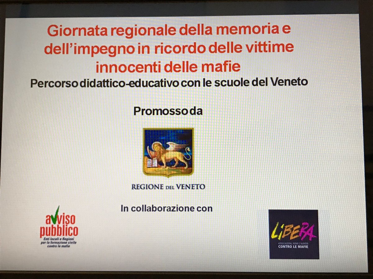 In vista della Giornata regionale della memoria e dell’impegno in ricordo delle vittime innocenti delle mafie, che si svolgerà a Padova il 21 marzo, grazie ad un progetto finanziato dalla Regione del Veneto (L.R. 48/2012), Avviso Pubblico sta realizzando una serie di incontri con 700 studenti di 14 istituti superiori di secondo grado per spiegare cosa sono le mafie, come agiscono – anche in Veneto – e per raccontare la storia di alcune vittime. Su quest’ultime, successivamente, i ragazzi e le ragazze produrranno un elaborato (un testo, una canzone, un video, ecc) che sarà presentato durante un evento che si svolgerà a Palazzo della Ragione il prossimo 21 marzo. Agli incontri nelle scuole partecipano anche i rappresentanti di Libera.