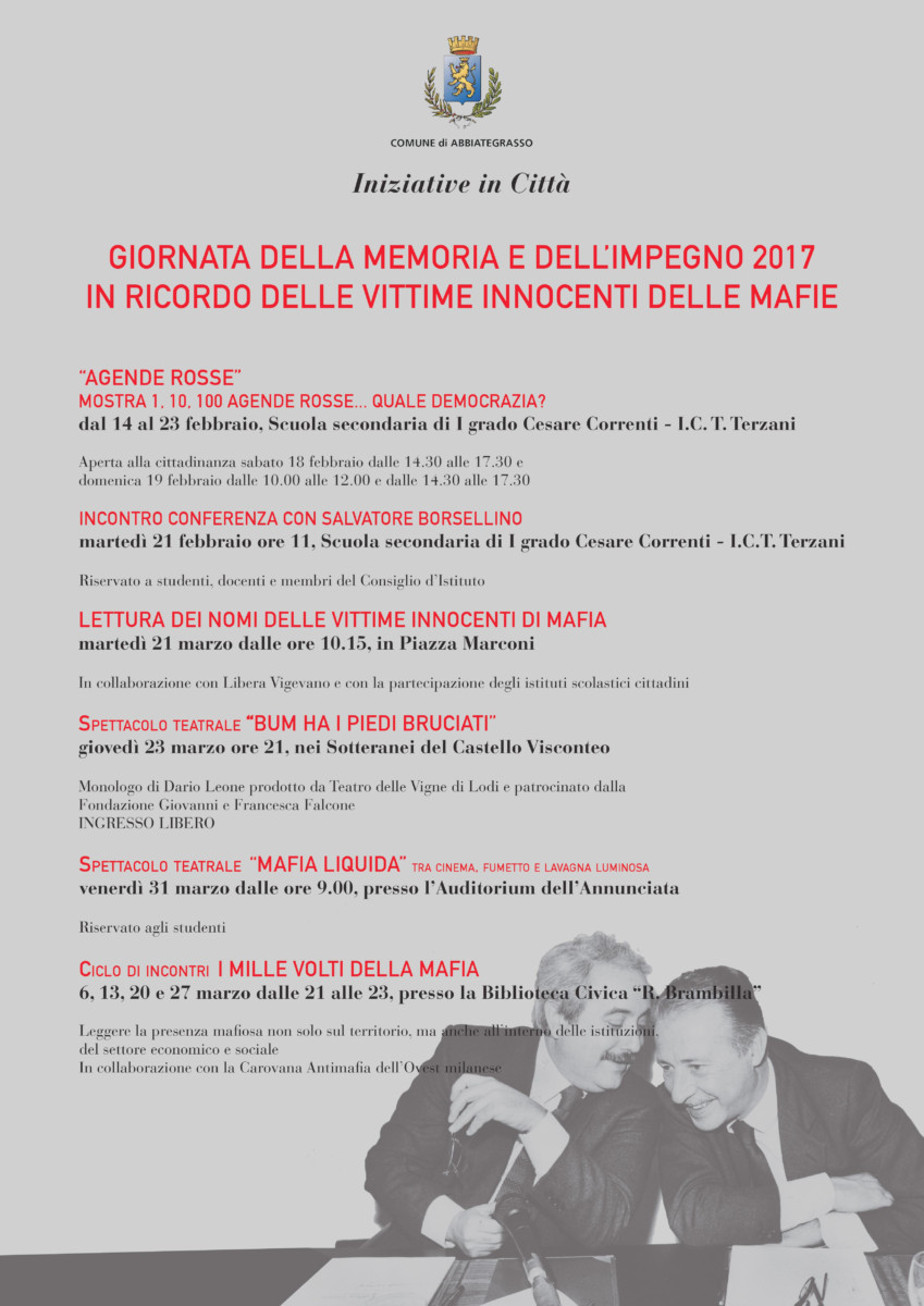 Martedì 21 marzo, l’Amministrazione Comunale invita tutta la città a partecipare alla “Lettura dei nomi delle vittime innocenti di mafia” in piazza Marconi dalle ore 10,15 in collaborazione con l’associazione Libera di Vigevano. Parteciperanno all’iniziativa le rappresentanze scolastiche presenti sul territorio.