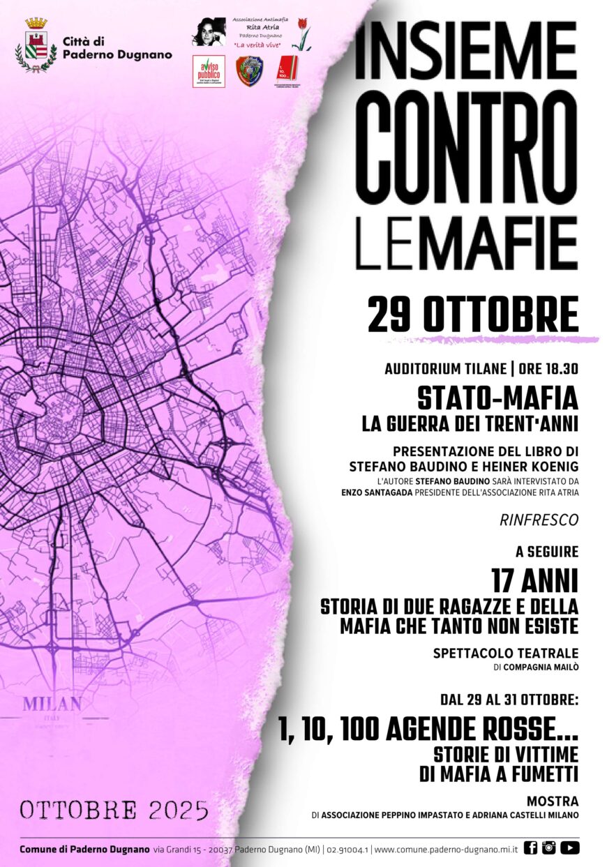 Nell’ambito della rassegna “Insieme contro le mafie”, mercoledì 29 ottobre, dalle 18:30 alle 21:30, il Comune di Paderno Dugnano organizzala presentazione del libro “Stato-Mafia” di Stefano Baudino e Heiner Koenig.